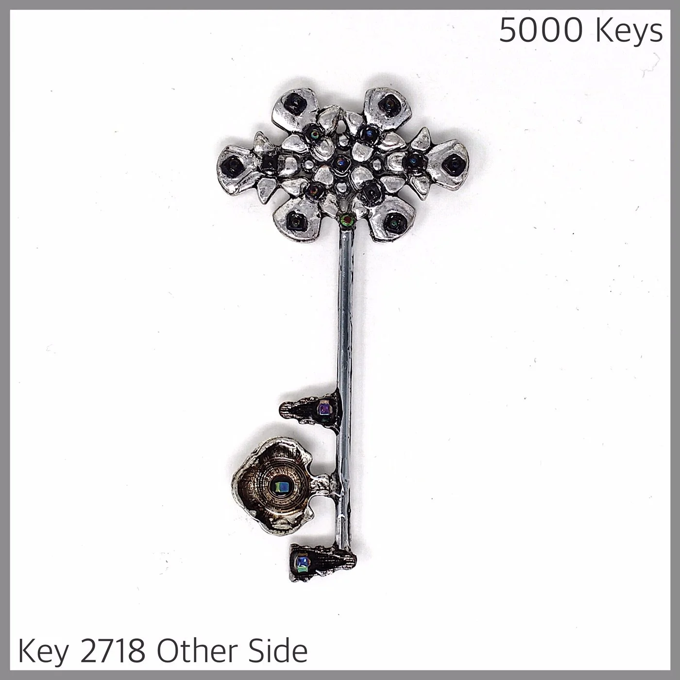 Key 2716 is made from some thrift store charms, rhinestones, beads, a metal rod that I can’t remember where I cut it from, and more squished lighter tops from the road.