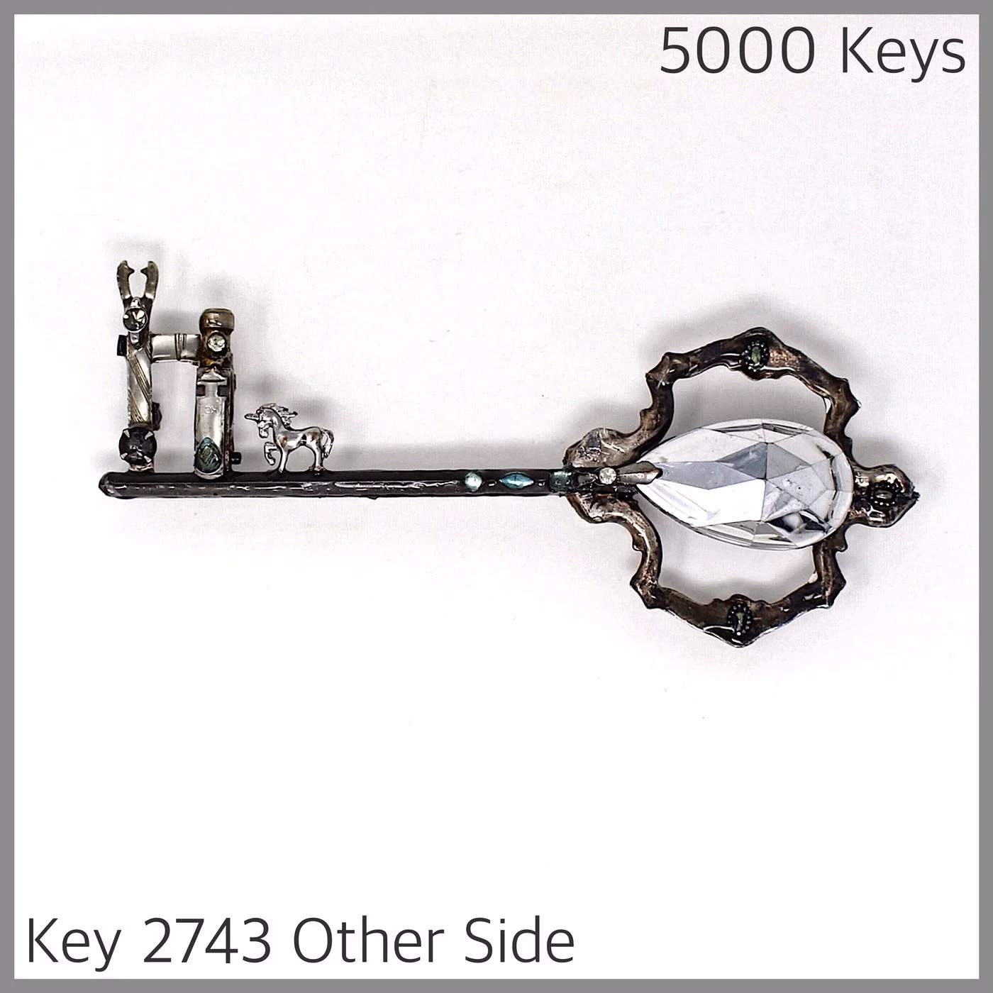 Key 2743 is made from a very large pendant, another screwdriver, a tie clip, jewellery bits, handles from a silver tray, more metal bits, and a little unicorn.