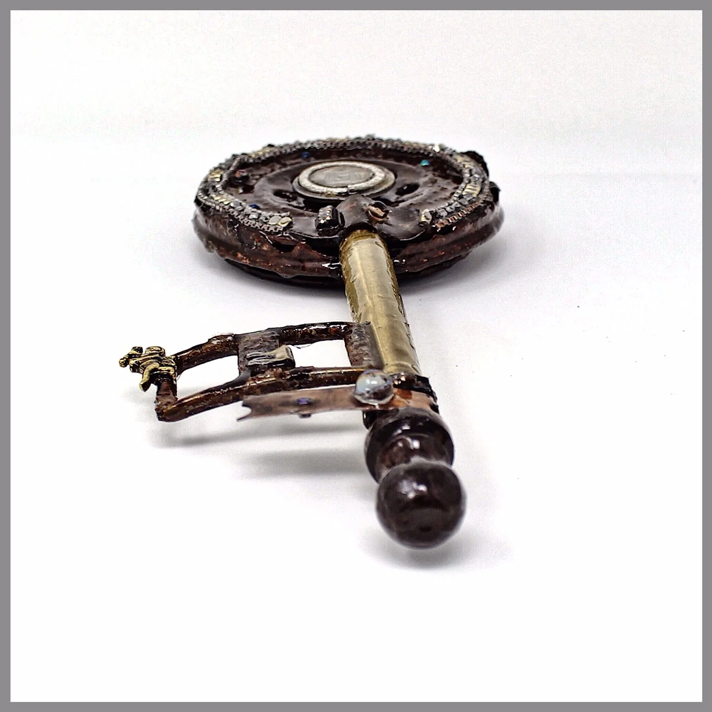 Key 2739 had so many parts behind the dragonfly before I finally (finally) decided to go with the leaf that has been on my workbench for several months searching for a home. Originally this key had a butterfly on the other side of that dragonfly that ended up breaking (lucky break I say as the piece wasn’t really working). Hey - maybe that’s another way to look at my own failings/breaking down — a lucky break ultimately as it got me out of a situation that wasn’t working. Lots of jewellery bits and bobs on this one along with a deconstructed key, part of a silver utensil, and the number 4.