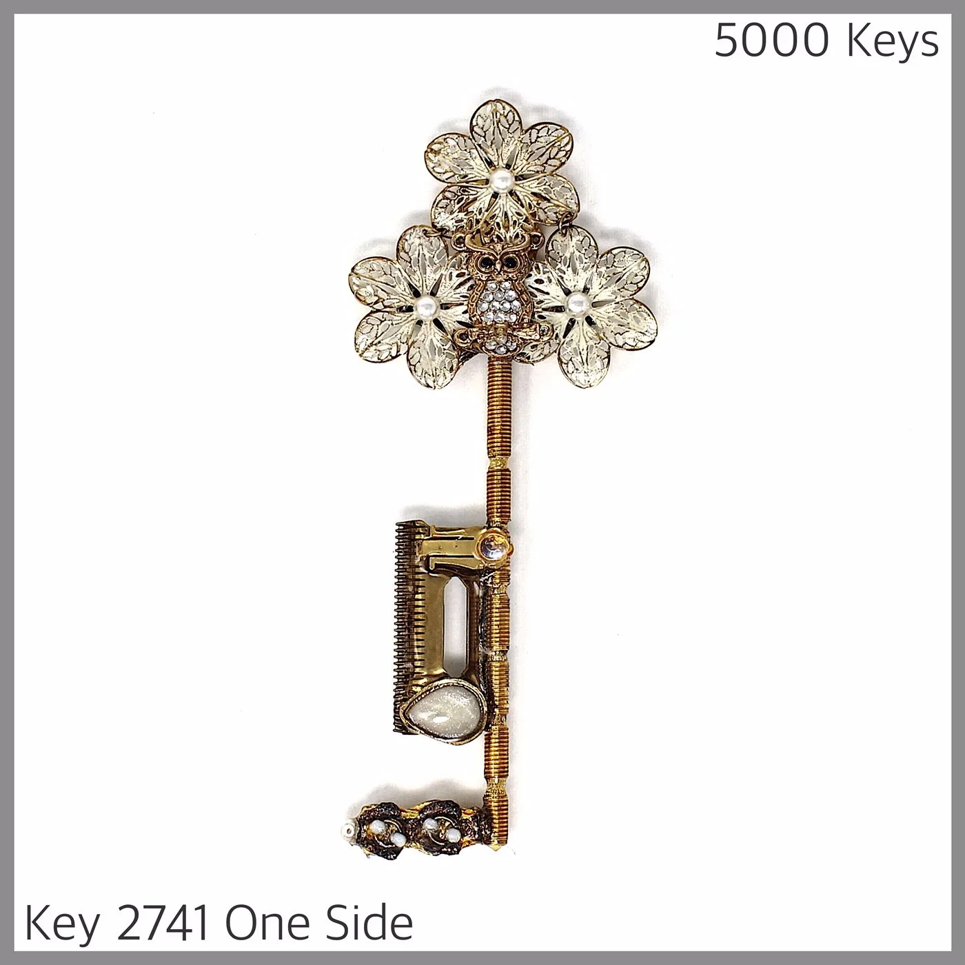 Key 2741 is made from necklace flower parts, an owl, more jewellery bits, a brassy hair clipper I found on the sidewalk near my studio, parts of the tuning section of a classical guitar, and some sort of long screw I got at the Restore.