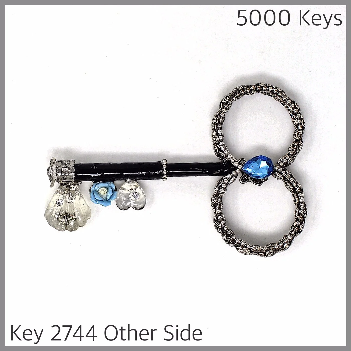 Key 2744 began life with some hoop earrings that had beads in them and a brooch that just didn’t work for me until I took it apart and used the shell, the flower, the heart, and the blue tear-shaped rhinestone separately. The beads came off the hoops and after initially leaving them blank (silver) I covered them inside and out with some lovely silver charms I got at a thrift store.